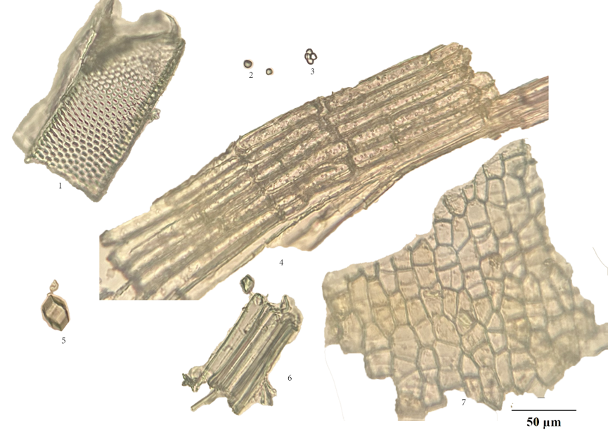 1. 导管; 2. 淀粉单粒; 3. 淀粉复粒; 4. 木薄壁细胞; 5. 草酸钙方晶; 6. 纤维; 7. 木栓细胞