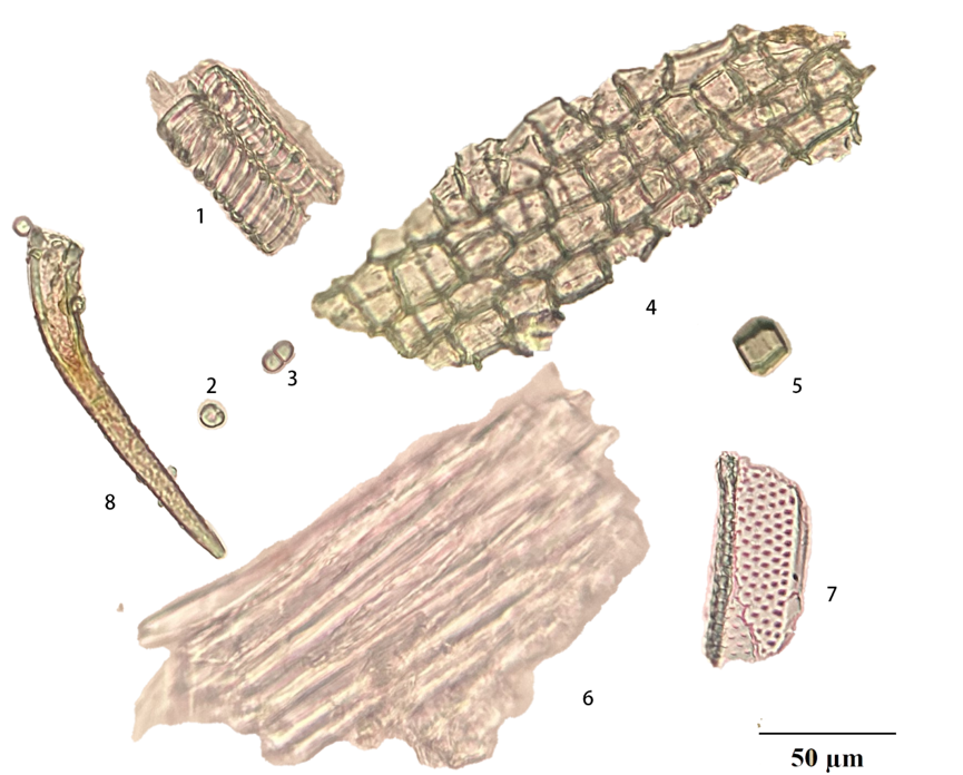 1. 螺纹导管; 2.单粒淀粉粒; 3.复粒淀粉粒; 4. 木栓细胞; 5.草酸钙方晶; 6. 纤维; 7. 导管; 8. 非腺毛